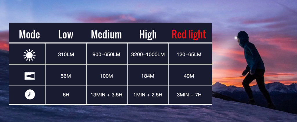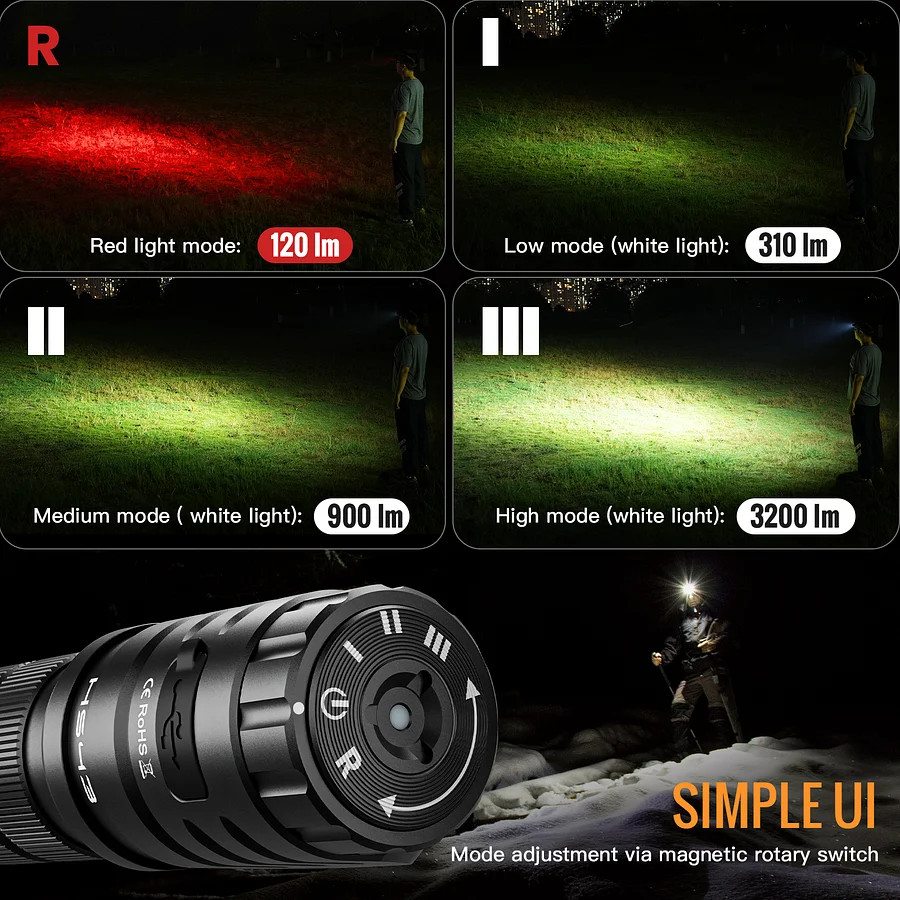 • Bela in rdeča luč: Preprosto preklapljajte med močno belo lučjo in rdečo lučjo za ohranjanje nočnega vida.