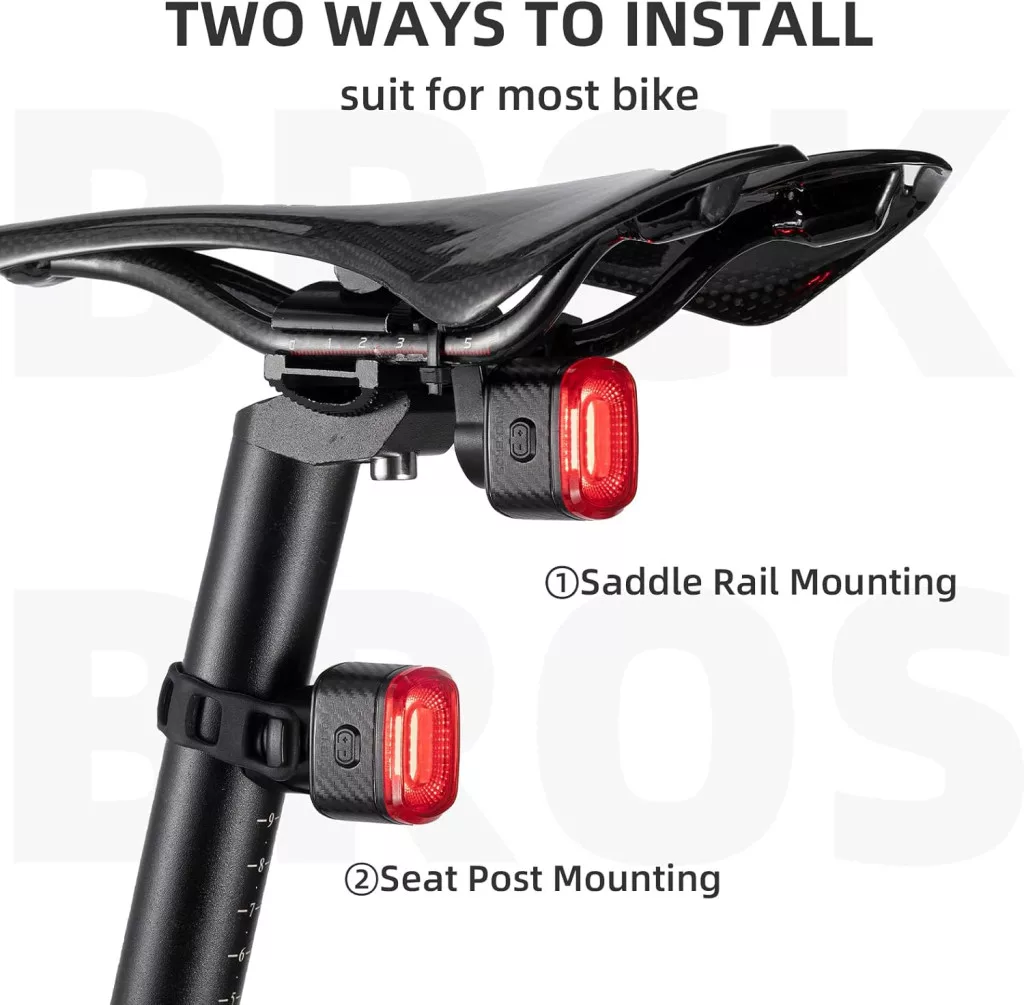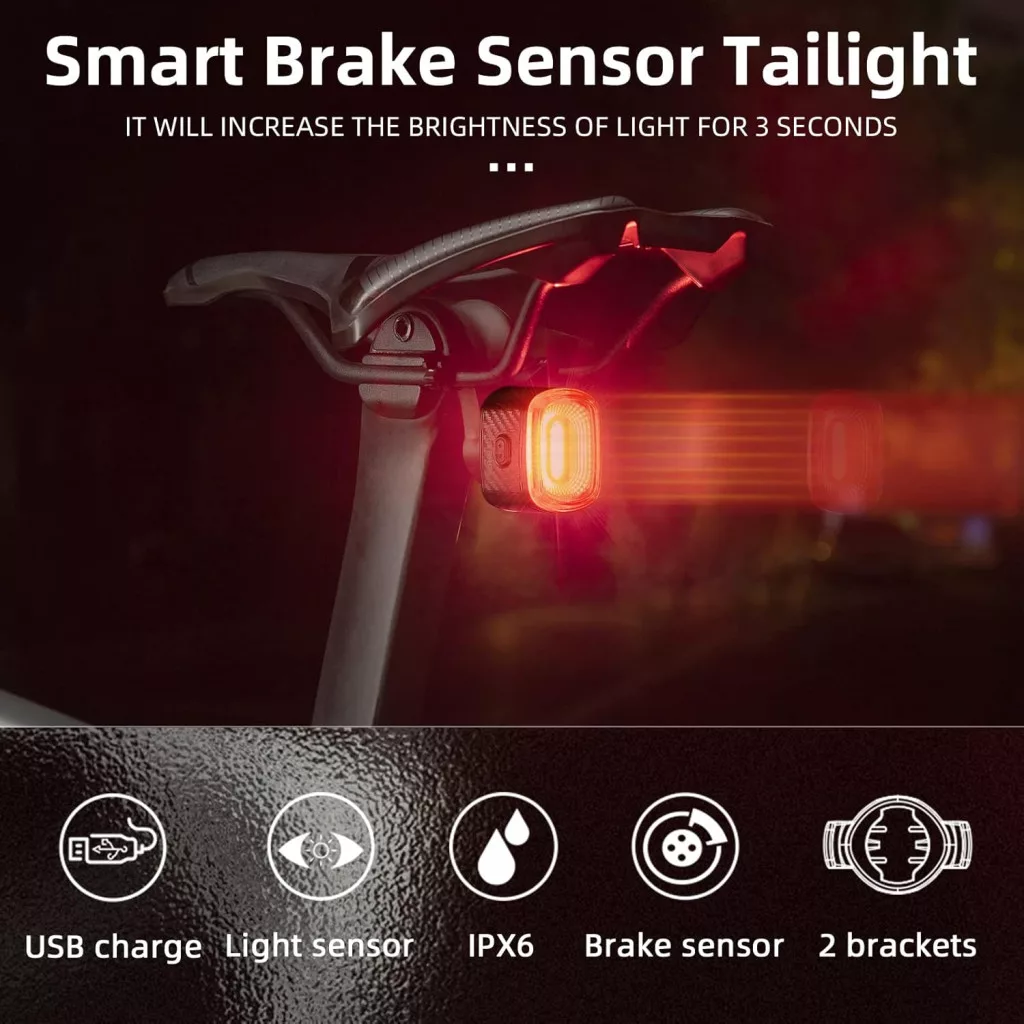• ZAVORNI SENZOR & SAMODEJNI VKLOP/IZKLOP: Svetilka se pri zaviranju samodejno okrepi, da opozori vozila in pešce za vami ter izboljša varnost ponoči. Opremljena s senzorjem gibanja in svetlobe – samodejno se izklopi po 30 sekundah neaktivnosti in znova vklopi ob premiku kolesa (v načinu 1 in 2). Izberite način 3 ali 4, da preprečite delovanje svetlobnega senzorja.