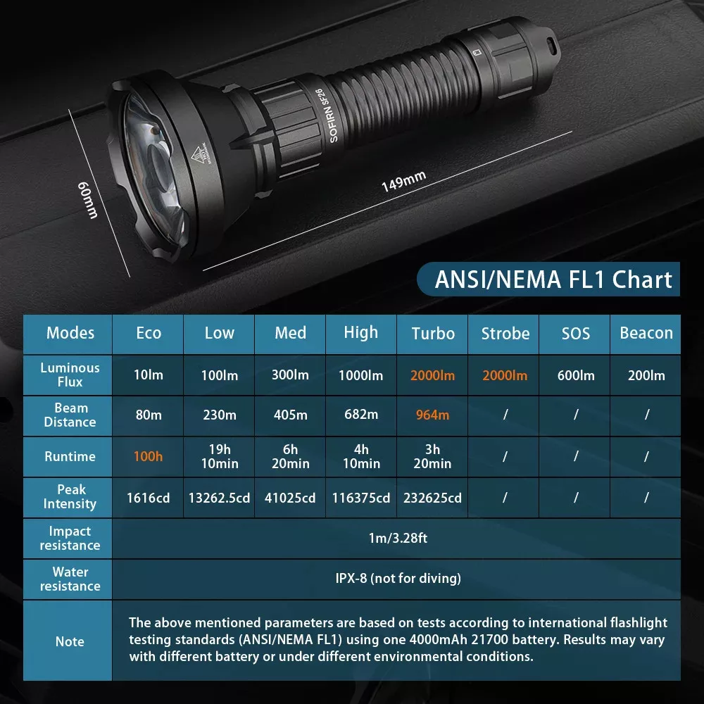 10. Advanced Temperature Regulation(ATR) technology: As the temperature rises, SF26 is programmed to automatically step down and step up the brightness to prevent over-heating.