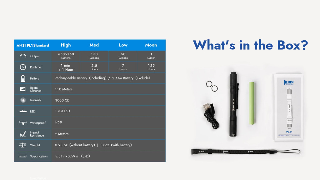 • 650 LUMNOV: Kompaktna svinčnik svetilka s 4 načini (650LM/150LM/50LM/1LM). LED diode oddajajo močno svetlobo za bližnje iskanje. Moonlight način (1LM) zdrži 125 ur.