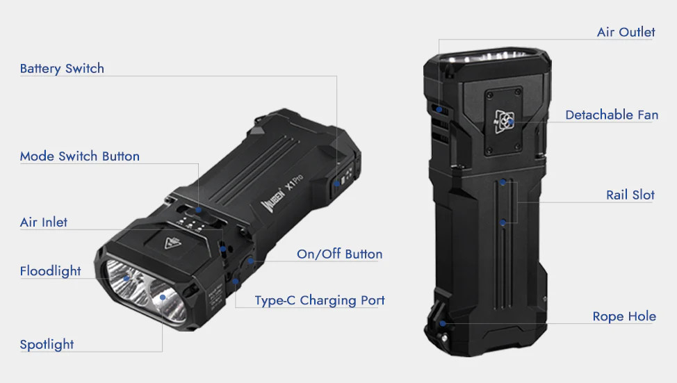 Wuben X1Pro svetilka s pametnim hladilnim sistemom, 12300 lumnov, 9600mAh baterija